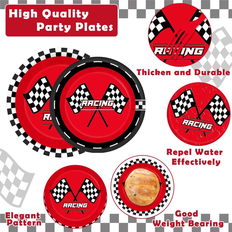 - Exciting racing design: Our race party plates showcase a bold red background with the word "Racing", along with classic black and white checkered flags and racetrack patterns. This vibrant design creates the ideal atmosphere for an exciting race-themed party, bringing an authentic and energetic touch to your decor.