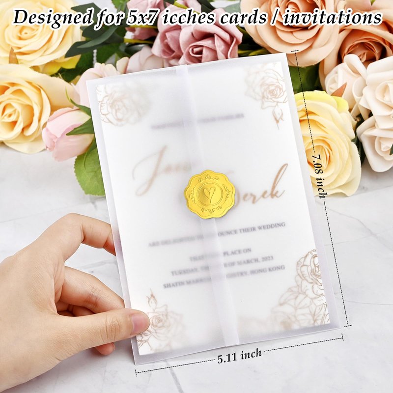 - Simple & Exquisite: Our vellum jackets for 5x7 invitations can add a matte touch to the cards and make your invitations cards look really classy, pre-fold design on jackets and self adhesive design on the gold stamp stickers can save your time and effort