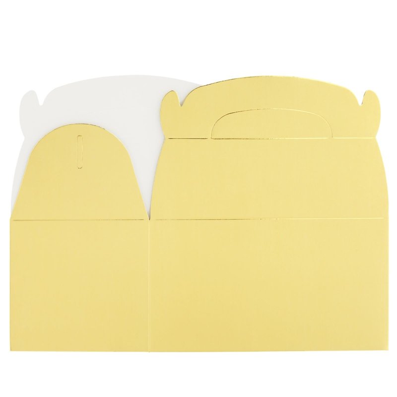 Delight your guests with these charming gold gable boxes for party favors, perfect for filling with treats and goodies such as baked goods, slime, jewelry, chocolates, prizes, cookies, stickers, and other party stuffers. The paper boxes with handles are designed for convenience and ease of use, requiring minimal assembly before they are ready to be filled with candy, treats, desserts, and delightful surprises. For added stability, apply tape to the bottom of the boxes during assembly. Once your gold goodie boxes are assembled and filled, place them strategically at the party entrance to ensure guests remember to grab one as they enter or exit the venue. These vibrant party favor boxes for kids birthday will leave a lasting impression and add a touch of elegance to any celebration.