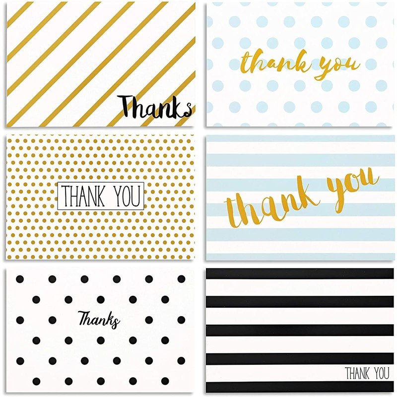 Send a heartfelt message to your loved ones with this set of 48 blank thank you cards with envelopes. Our greeting cards assortment pack features 6 striped and polka dot retro designs in black, blue, and gold foil. An attractive "thank you" text is printed on the front of each small 4x6-inch thank you note card. The blank interior ensures you have more than enough space to send personalized wishes to coworkers, friends, and family members. Our assorted greeting cards are perfect to use as baby shower or birthday thank you cards with envelopes. Also great for weddings, graduations, holidays, and housewarming parties. With several modern assorted designs to choose from, you’ll find the perfect greeting notecard to express your gratitude and well wishes!