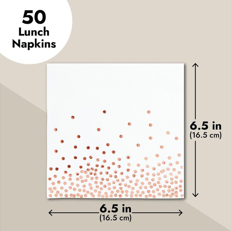 Add these beautiful and elegant white and rose gold paper napkins to your party decorations! The rose gold foil confetti design on these disposable paper napkins is sure to go with a variety of themes and occasions including outdoor weddings, bridal showers, bachelorette parties, baby showers, gender reveal party decorations and classic tea parties. Each square luncheon napkin measures 6.5 x 6.5 inches, perfect for place settings and dessert tables. You will receive a total of 50 decorative rose gold polka dotted napkins.