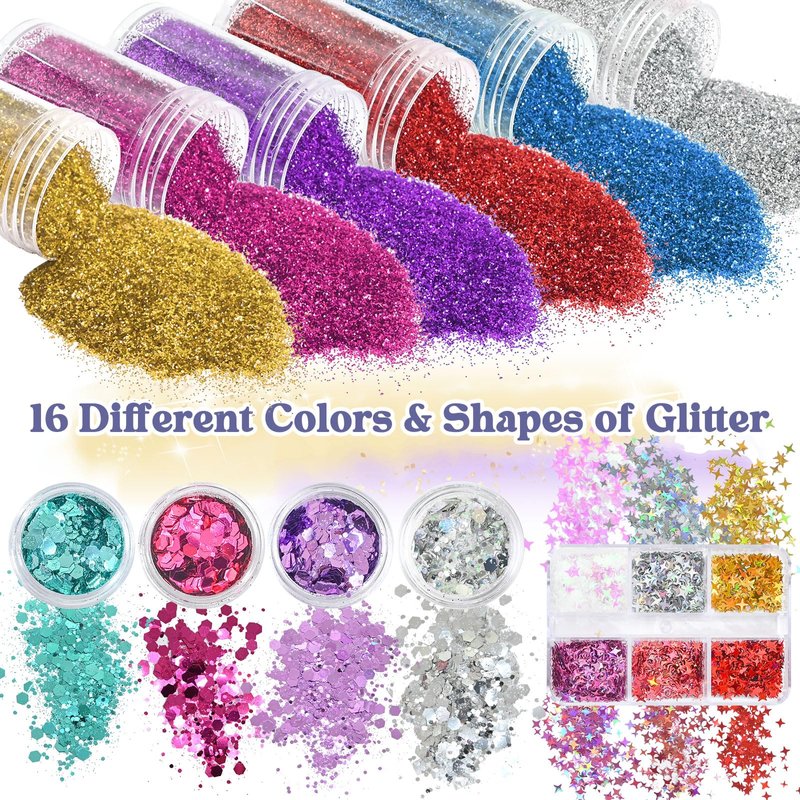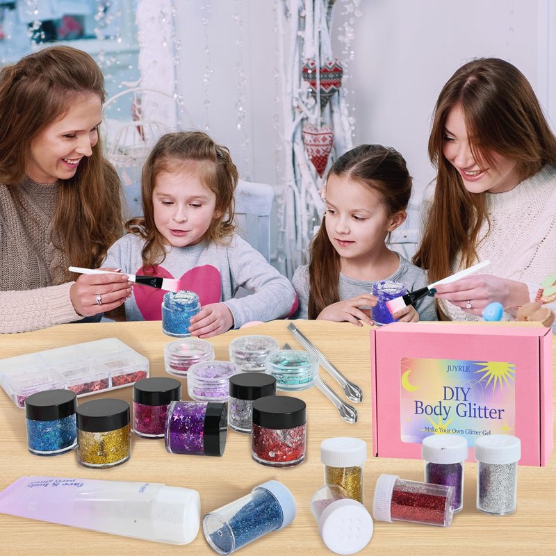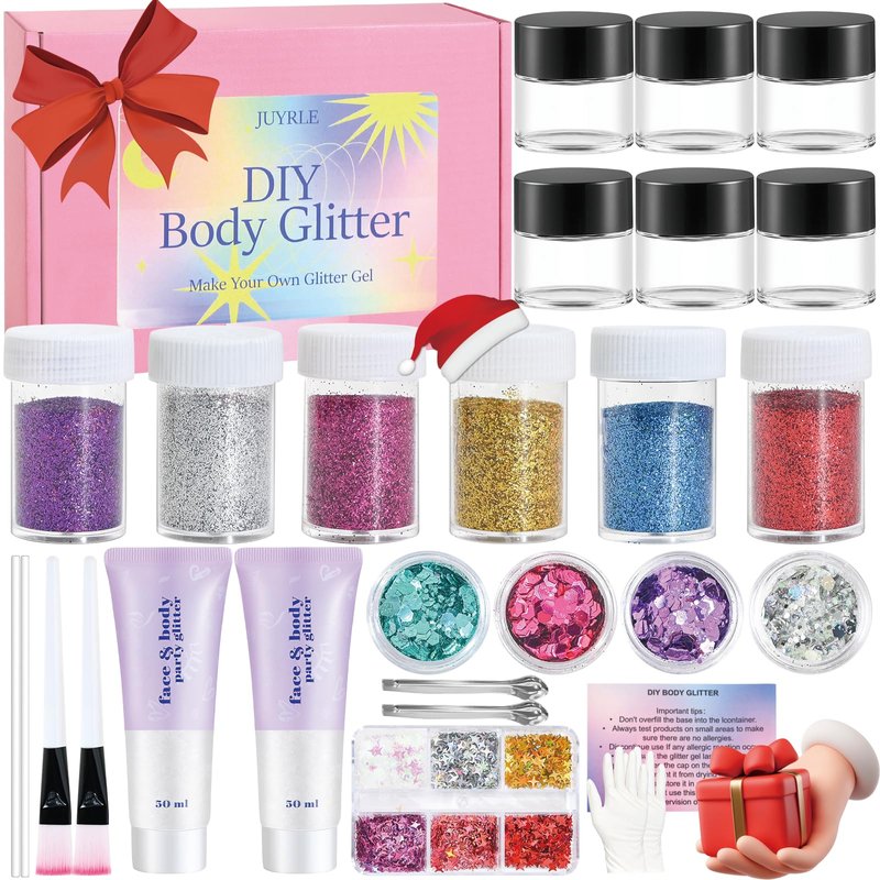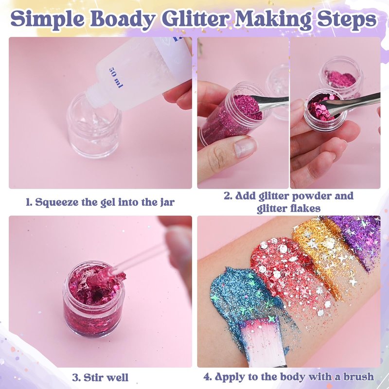- 🎁Body Glitter Gel: JUYRLE body glitter gel making kit to create your own sparkling body and face glitter. It includes: 2x 50ml glitter gel base, 6x glitter powder, 6x jars, 6x star sequins, 4x hex's sequins, 2x brushes, 2x spoons, 2x stirring sticks, 1x gloves, 1x instructions, 1x exquisite box. You can freely mix and match 16 kinds of bright face glitter powder to meet different occasion preferences.