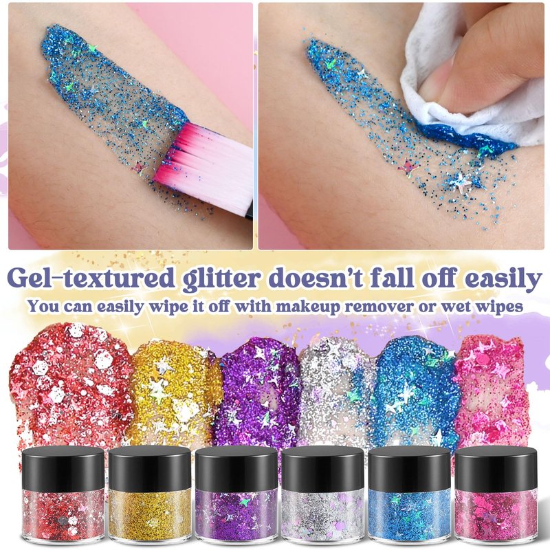 - 🎁Easy to Apply & Clean: The facial glitter gel base has a good viscosity, so you don't need to use extra glue. You can easily apply the skin glitter gel with a brush or your hands, enjoy its smooth texture, and dry quickly after application, making your makeup more natural. After the party, you only need to use makeup remover wipes or shower gel to clean it without leaving stains. (Note: Please use it as soon as possible after opening, it will easily dry out when exposed to the air)