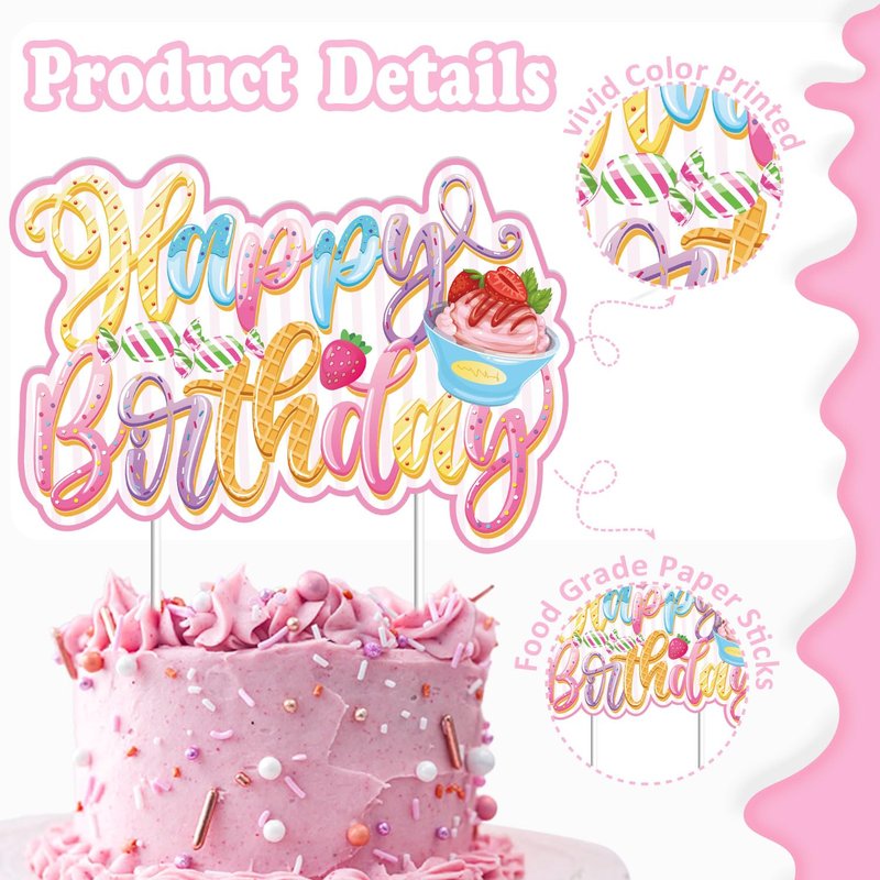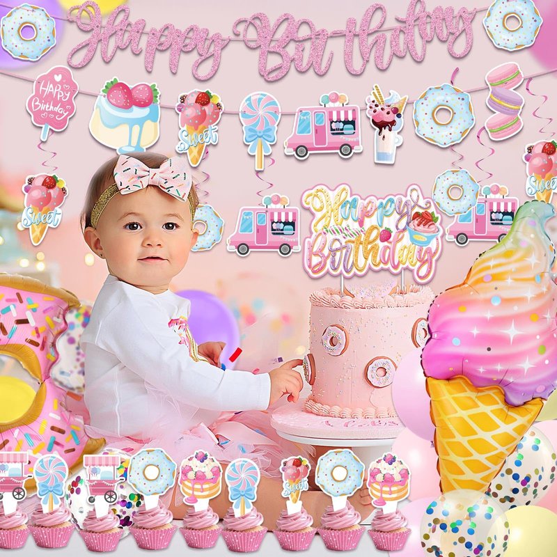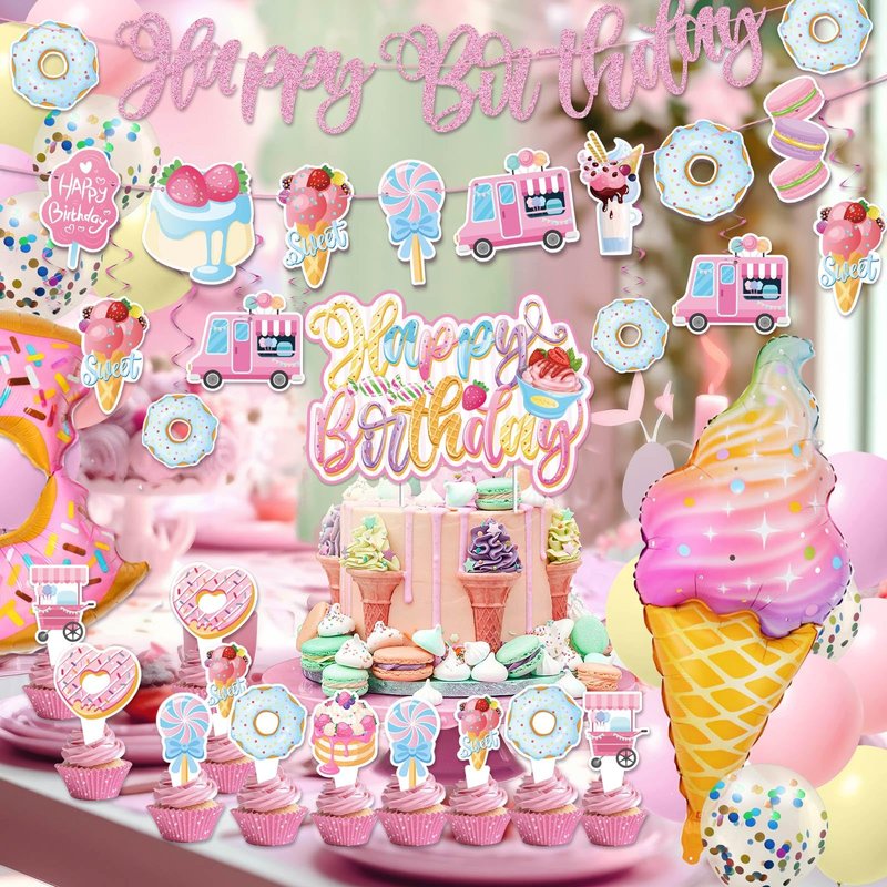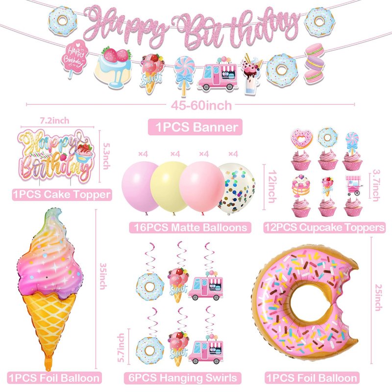 - đăSweets Birthday Party Decorations Setă - Girls birthday set with 1x âHappy Birthdayâ ice cream and donut banner, 1x Ice cream balloon, 1x Donut balloon, 1x Cake topper, 6x Hanging swirls, 16x Latex balloons, 12x Cupcake toppers. Create a sweet one decorations filled with cuteness and romance where everyone can have fun with these donut party decorations.