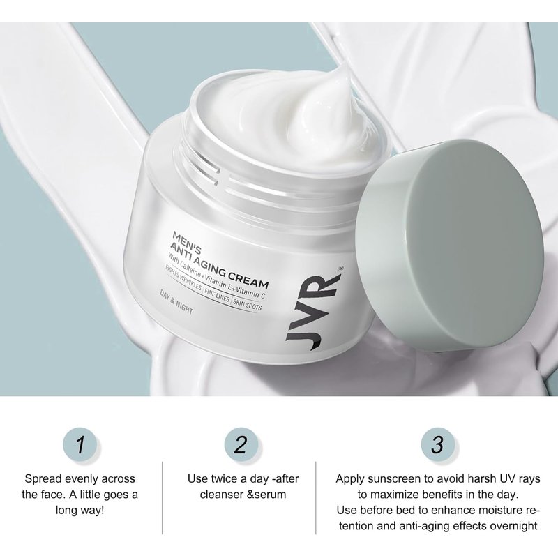 - 【ACHIEVE YOUTHFUL TIGHTNESS】JVR anti-age cream is a perfect face moisturizer for men. It hydrates, tightens, and leaves skin feeling rejuvenated, and significantly diminishes wrinkles,lines, crow's feet, and other signs of aging. Great Mens facial moisturizer