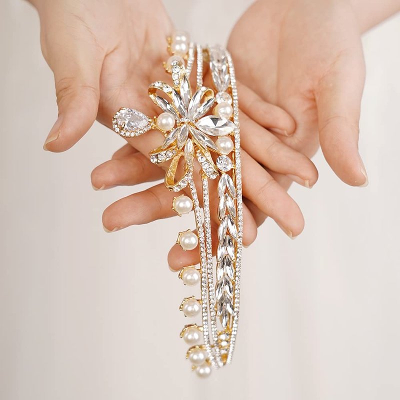 JWICOS Gold Pearl Tiara Crown for Women Crystal Headband Headpiece Princesss Crown Tiara for Brides Bridal Wedding Tiara for Prom Pageant Gift (Gold)