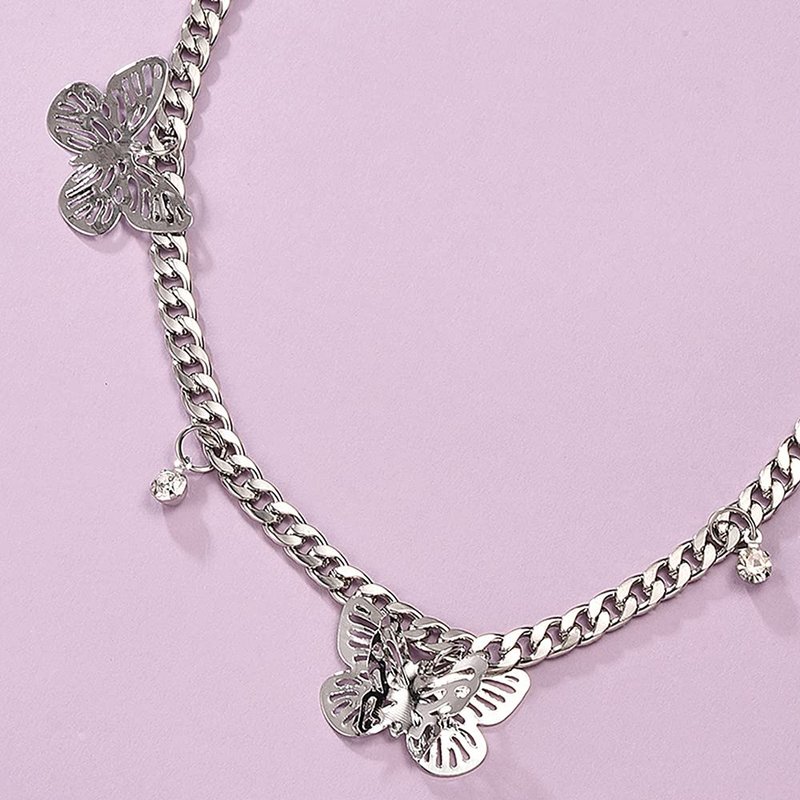 JWICOS Silver Necklace for Women and Girls Butterflies and Rhinestones Pendant Chunky Chain Miami Cuban Link Chain One Layered Choker for Women (Silver)