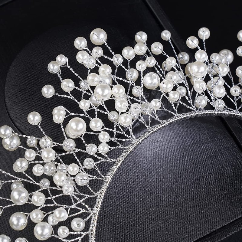JWICOS Vintage Wedding Pearl Beads Tiara Hair Crown Handmade Bride Headband Bridal Pearl Head Pieces for Wedding Prom Birthday (Silver)
