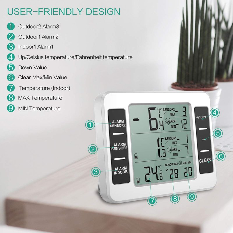 - Multiple installation options: The wireless freezer thermometer is easy to install. Indoor outdoor thermometer, with built-in magnets, a hanging hole and a bracket on the back, you can attach the main unit to your fridge door, hang it on the wall or stand on the table. 2 sensors with clamps and hanging holes on the back, convenient to attach or hang on the shelf.