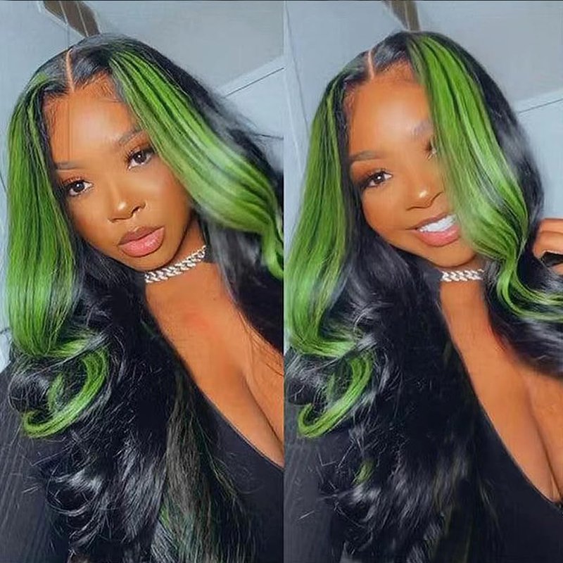 - 1.Skunk Stripe Wig ,200% High Density 13*4 Highlight Green and Natutal Black Lace Front Human Hair Wigs ,very soft,no shed.no tangle.always pursues for the highest quality.There is a beautiful box, suitable as a gift for your family, loved ones and friends.Fashion,personality, elegance, is every woman's choice.