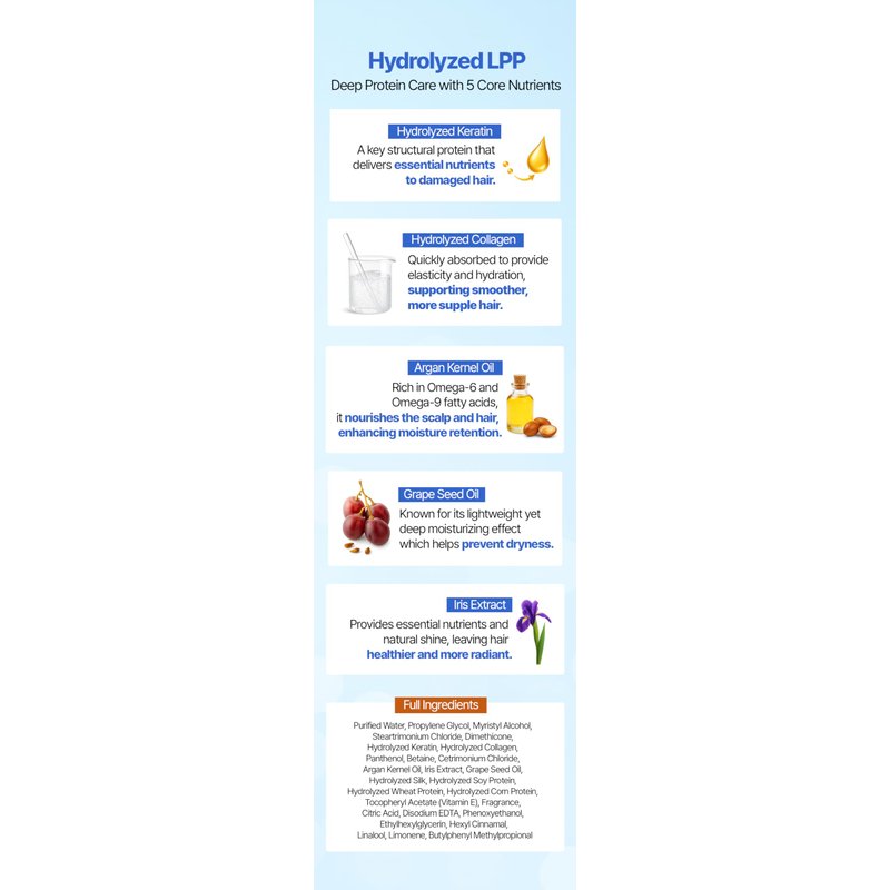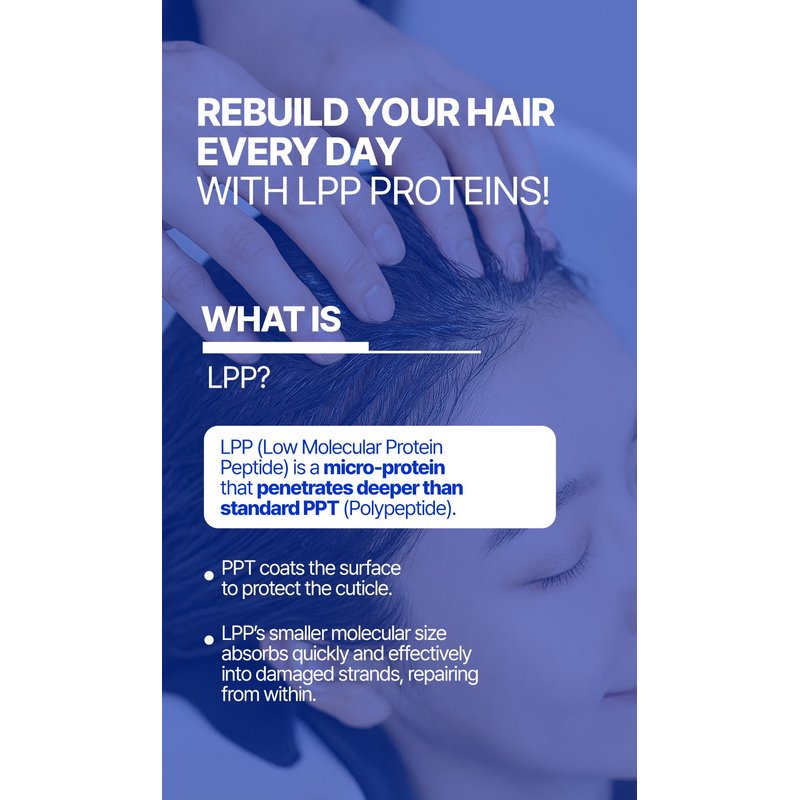 Experience the science of K-beauty with our Professional LPP Hair Repair Treatment—a luxurious deep-conditioning mask designed for damaged, dry, or color-treated hair. This intensive treatment is infused with premium ingredients such as hydrolyzed keratin, hydrolyzed collagen, silk protein, argan oil, and grape seed oil to deeply nourish and strengthen each strand. Inspired by Korean salon treatments, our LPP formula penetrates the hair shaft with low molecular weight proteins to repair from within, leaving your hair smoother, shinier, and more manageable. Enjoy five visible hair transformations: radiant shine, natural volume, bouncier texture, long-lasting hydration, and silky flexibility. With 20X more nourishment than regular protein treatments, this formula is perfect for anyone looking to restore their hair’s natural beauty. Safe and effective, our treatment is free from harsh chemicals and enriched with Acorus Calamus Root Extract—an herbal remedy trusted in Korean haircare for generations. Treat your hair to the ultimate K-beauty solution for softness, strength, and salon-worthy results at home.