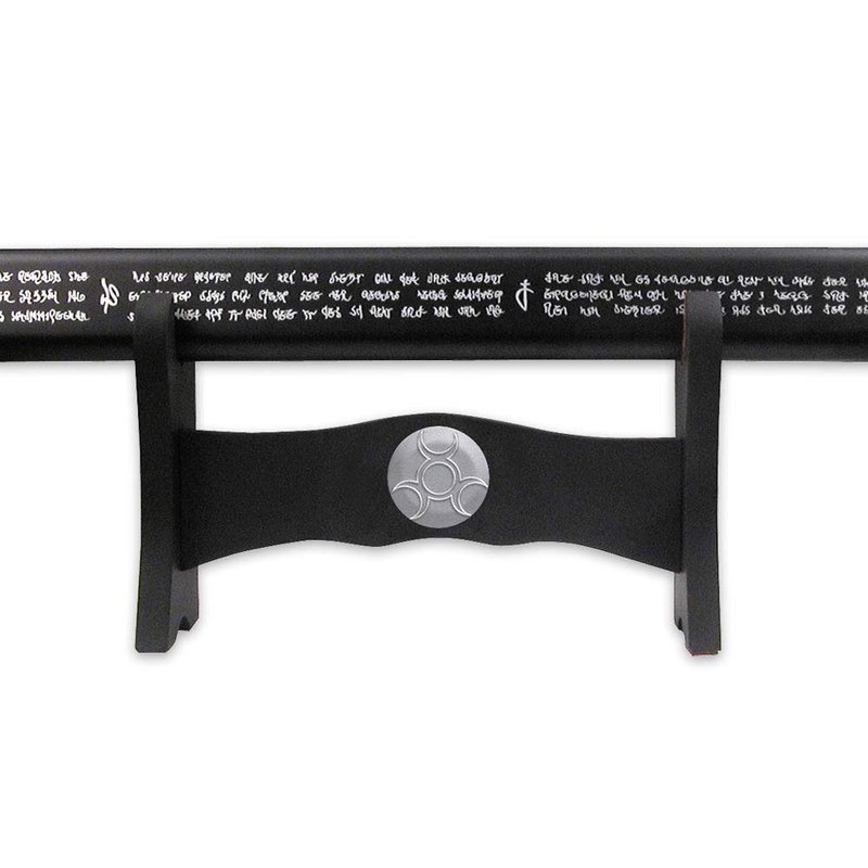 The uniquely styled blade features three edges in total thanks to the wide, slanted tip design. The entire blade is covered with intricate engravings and makes a striking impression once unsheathed.