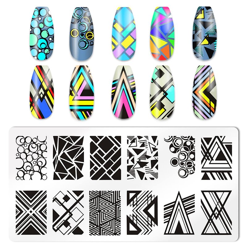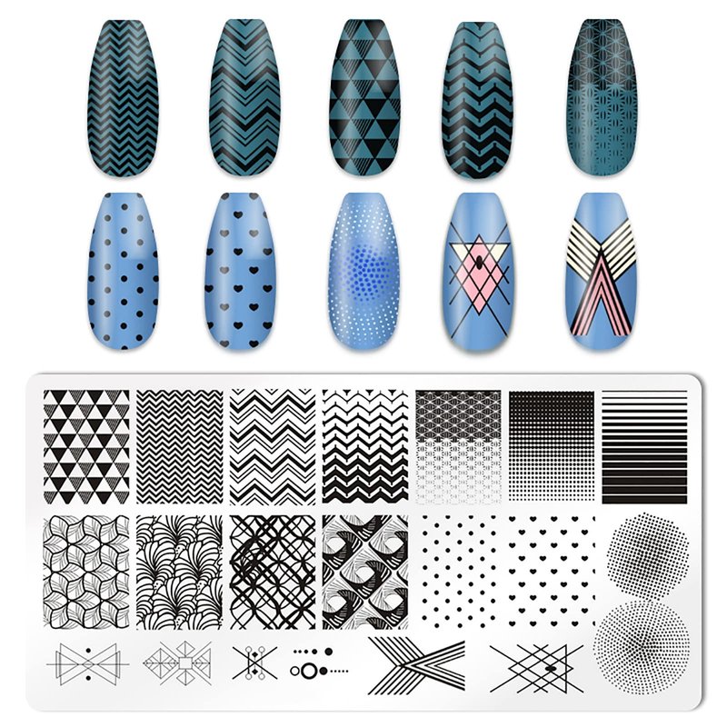 - Valuable Package: you will receive 5pcs nail stamping kit, 1 nail stamper, 2 scraper, the nail template includes in the pattern of geometry design, plaid, chessboard, etc. It is made of 304 stainless steel, thickness enough to ensure will not bend;measuring about 2.4*4.7 inches.