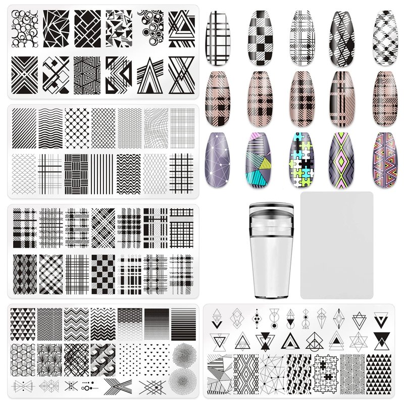 KAAGEE 5Pcs Nail Stamping Plates Plaid Nail Stamps Nail Art Stamping Plates Geometry Nail Stencils Nail Plate Template Nail Art Stamping Kit Nails Accessories with 1 Nail Stamper, 1 Scraper