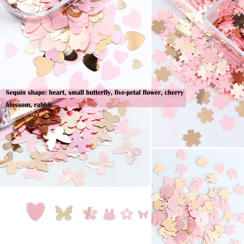 - 【Package Includes】You will receive 12 grids of holographic gold pink nail glitter, including flowers, butterflies, rabbits, cherry blossoms, hearts and other shapes. Each color of nail sequins is individually packaged in a container, So you don't have to worry about the sequins mixing together.