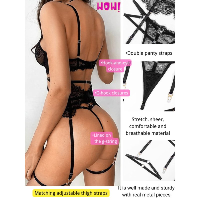- ✿Style: This strappy lingerie set with unique eyelash floral lace overlay can enhance femininity and outline your sexy body lines, making you more charming.