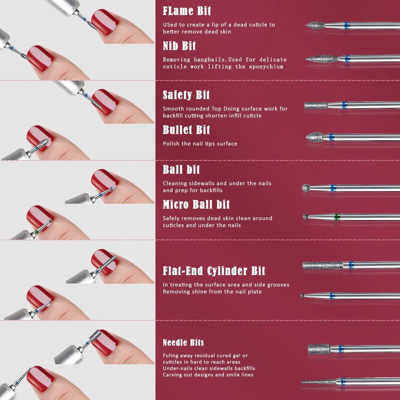 - 1. The nail drill bits Set with 20pcs Special Under Nail Cleaner(UNC) Bits, 3pcs Ball-shaped Bits, 4pcs Flame Bits,3pcs Cylindrical Bits & 1pcs Brush, 9pcs ceramic nail file bits. Suit for both beginners and professionals.