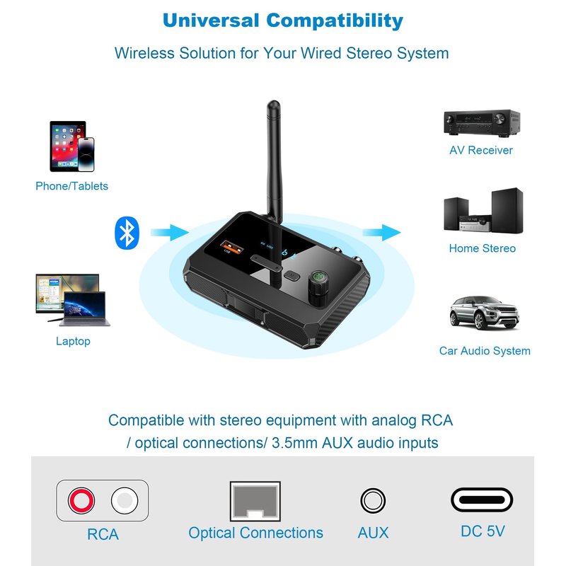 - BLUETOOTH RECEIVER FOR HOME STEREO: Bluetooth adapter for stereo receiver stream music from smartphones/tablets/laptops to your home stereo/vintage speaker/car stereo system, and give you great sound. Bring your old stereo system into the future with a Bluetooth wireless audio adapter.