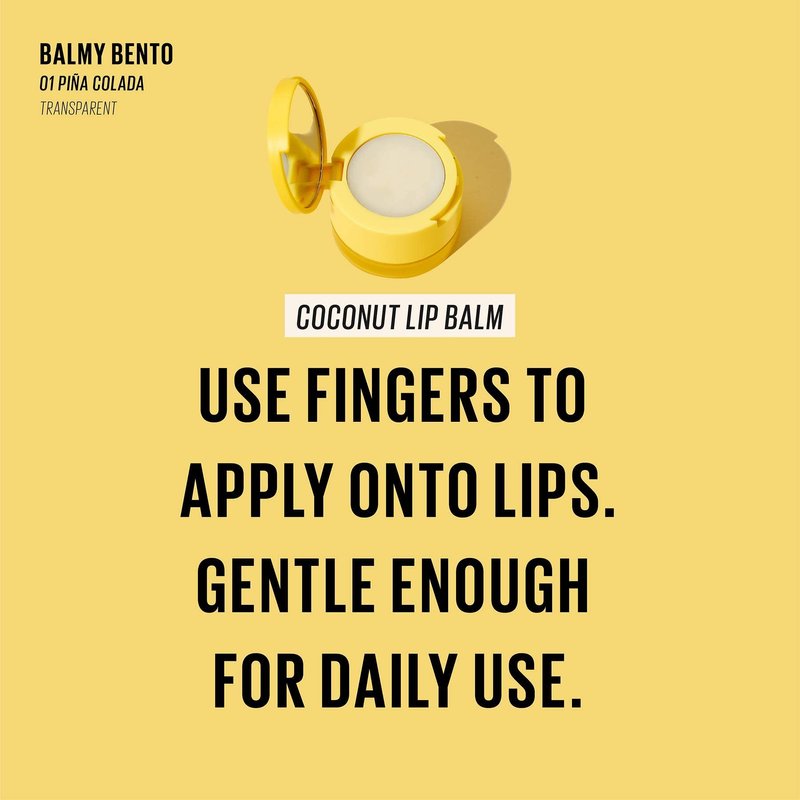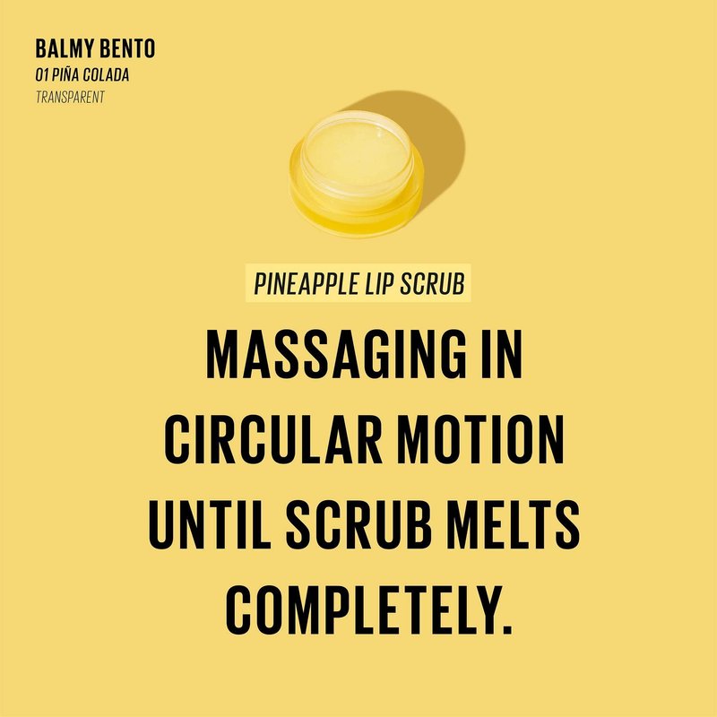 - 💜 BALMY BENTO: A two-in-one, stacked coconut lip balm and pineapple lip scrub that softens and smoothes lips. This lip duo is made with two nourishing formulas that soothes chapped lips, and leaving super soft finish.