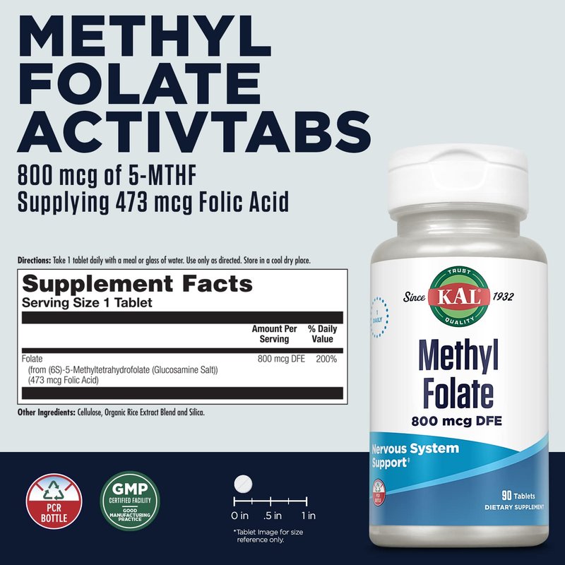 KAL Methyl Folate 800 mcg DFE, 5-MTHF Active Form Vitamin B9, Folic Acid Supplement, Heart Health, Prenatal, Mood and Brain Support, Fast Dissolving ActivTab, 60-Day Guarantee, 90 Servings, 90 Tablets