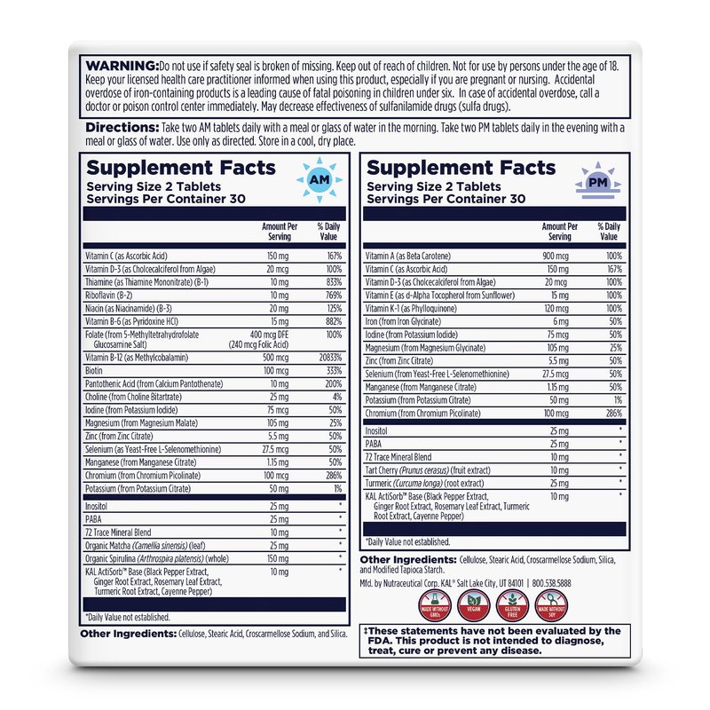 Maximize your daily multivitamin. Our 24-Hour daily multivitamin for women and men comes with two unique formulas to keep you active and alert in the morning and relaxed and recharged in the evening; no melatonin included. Because timing is key, our unique mens and womens multivitamin is formulated to provide nutrients best utilized in the morning like Vitamin B12, Magnesium Malate, and Organic Spirulina, and nutrients best utilized in the evening like Vitamin D, Magnesium Glycinate, and Tart Cherry, while dividing doses of zinc and magnesium for gentle digestion. Double doses of magnesium and trace minerals fuel in the morning and replenish in the evening. Our vegan multivitamins are made with iron and without calcium and are designed for immune support, antioxidant support, and cellular support. Like all KAL products, our Multivitamin for Men and Women AM/PM is lab verified for purity, potency and identity. Confidence in the KAL name is just one of the reasons we’ve been around so long and maintain our place as a leader in the industry. Unlike many other companies, we manufacture almost all our own products in our GMP-certified facility and thoroughly test and screen raw ingredients for the slightest amount of impurities. Managing the production process from start to finish allows us to provide the best possible quality. Rest assured, only the purest formulas ever reach your cabinet.