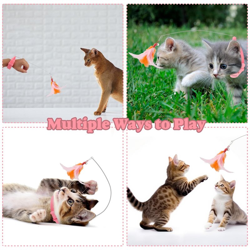 Product Includes: You will receive 2 pieces of cat teaser toys with 6 pieces replacement feathers. The sound of the bell and feathers will attract cats' attention and stimulate cats' s hunting instincts, a good cat self play toys which can free your hands. Premium Material: The collar is made of quality rubber, soft and lightweight, it will not harm your cat or make it feel uncomfortable, sturdy, withstands cats' teeth and claws great. The wand is made of bendable steel, sturdy but flexible. Adjustable Collar: The cat collar is adjustable, you can adjust it to make it comfortable for your cat to wear, suitable for cats of all ages and size. With the stainless steel buckle ,it is easy to install and remove. Bendable & Rotatable Wand: The cat wand toy is flexible ,so you bend and rotate it for any angle to fit for your cat playing. Multiple Ways To Play: These feather cat collars toys are practical, you can worn around the cat's neck, or fix silicone collar on cat trees, cat beds, table legs and your hands or ankle if you do not have time to play with the cat.