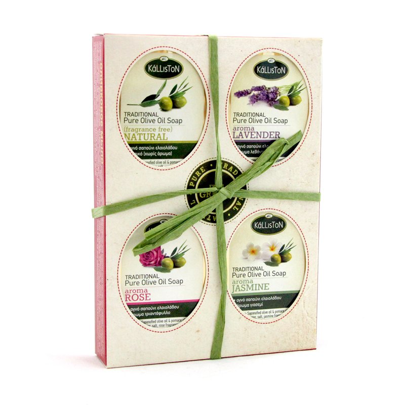 Kalliston, Olive Oil Soap Gift Set, Lavender, Rose, Jasmine, & Natural Aromas, All Natural Soaps, Made in Ancient Crete, Greece, Pack of 4