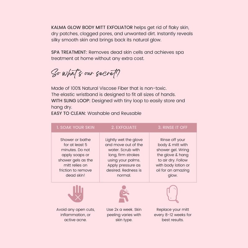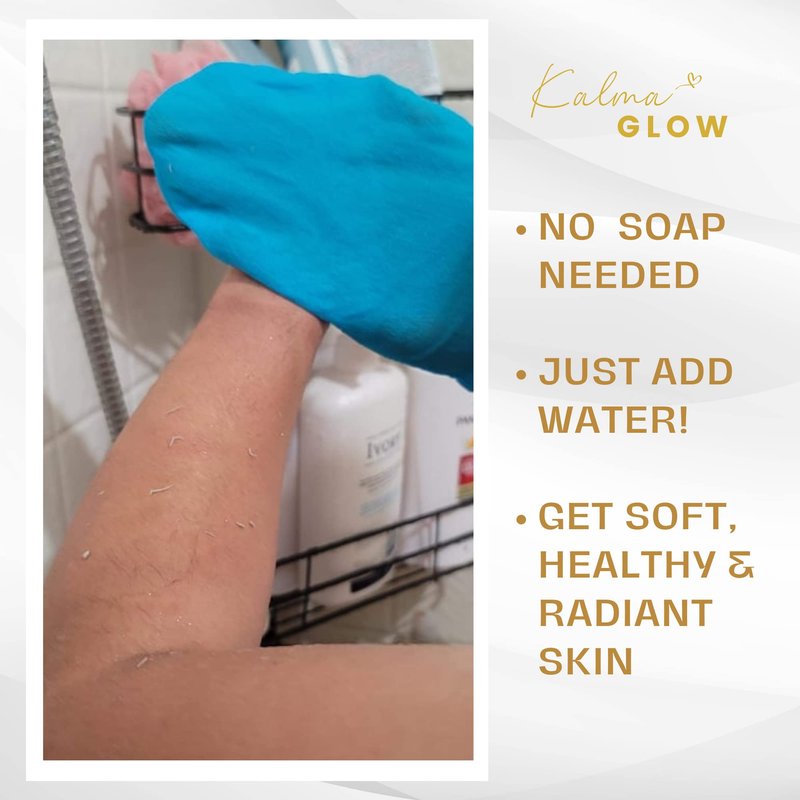 Get glowing! Everyone deserves to glow, and with Kalma Glow exfoliating gloves for body, you can be sure you're getting a safe, natural and healthy way to scrub away dead skin and unblock pores. Exfoliating is an important step in any skin care routine, and our deep exfoliating gloves makes it easy to do without damaging the skin. This shower mitt is the perfect way to give your skin what it needs to look and feel its best. It's made with 100% viscose fiver so it's safe for sensitive skin, you can deeply exfoliate without harsh chemicals or damaging acids - only water! Simply wet the wash gloves and use it in a circular motion to gently massage your face or body. For an intensive treatment: For deeper exfoliation and hydration, apply a moisturizer or treatment oil beforehand and follow with exfoliation using the bath mitten for best results (this is also great for those who suffer from acne. Say goodbye to dull and lifeless skin with our natural and easy-to-use Kalma Glow exfoliating wash gloves!