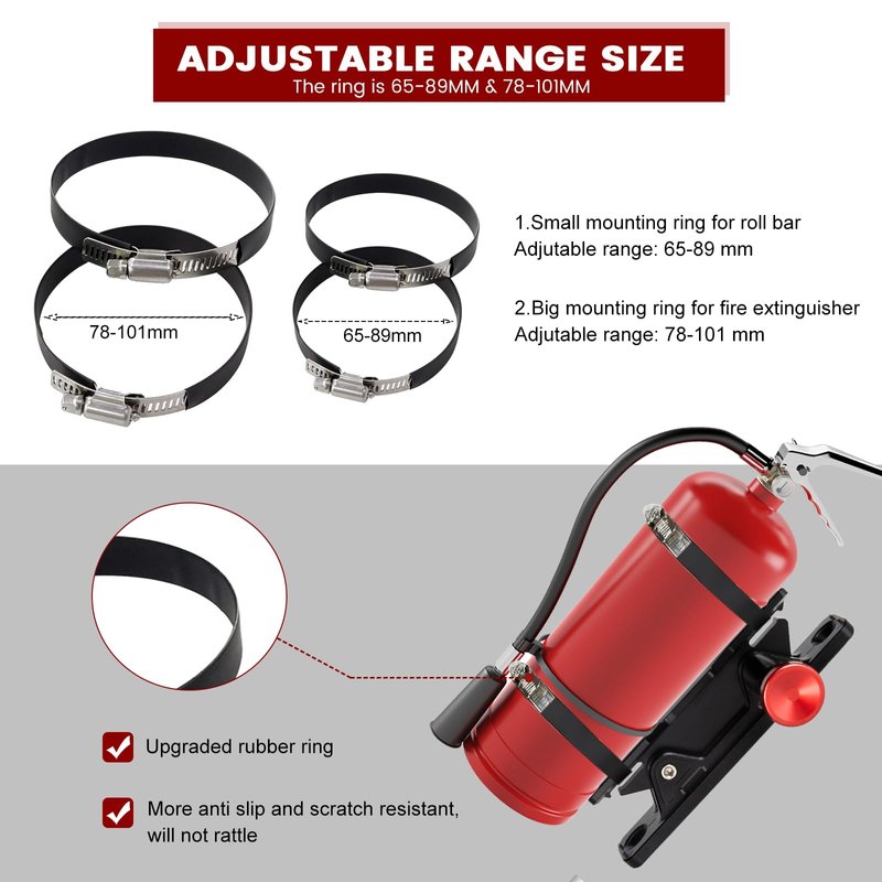 - 【Simple Installation】Easy to install, one hand pull the knob out horizontally, the other hand pull the fire extinguisher vertically. Attach the fire extinguisher bracket to the roll rack by adjustable rings,no drilling.