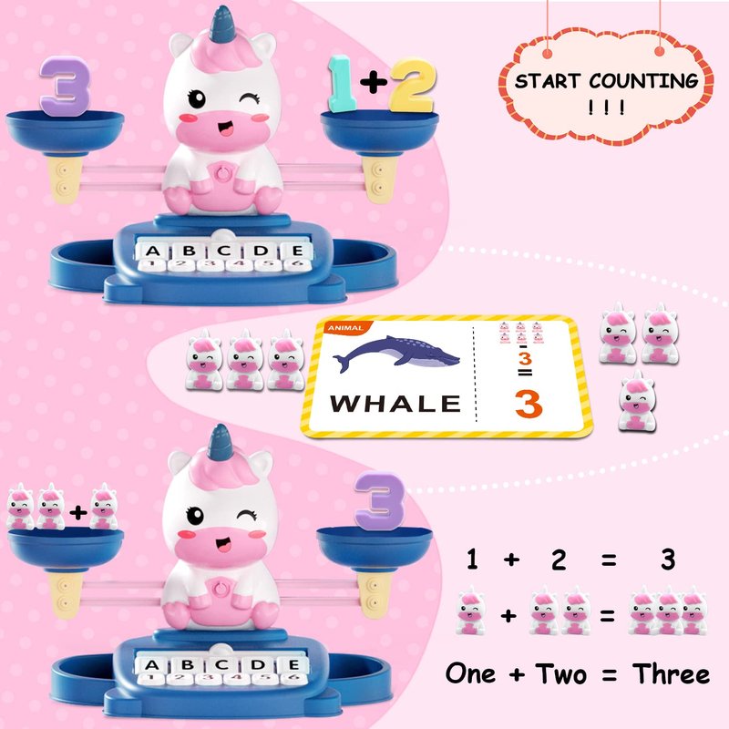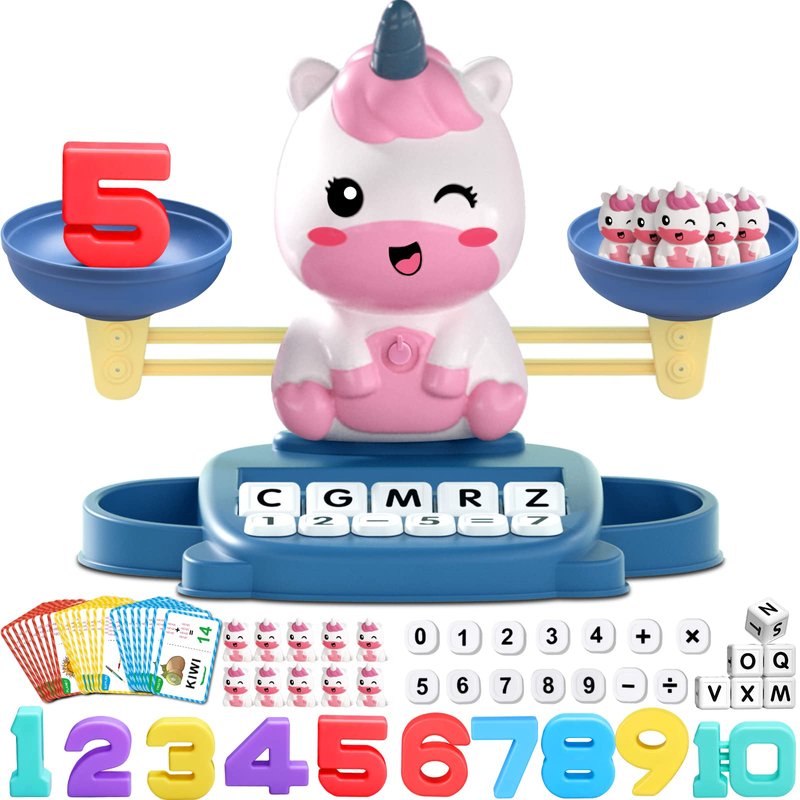 - Unicorns learning & educational toys : Package contains 1 balance, 2 trays, 10 colorful digital weights, 20 small unicorn weights, 32 cards (4 colors in total, containing 64 words, 3, 4 and 5 letter words), 10 letter cubes and 25 number blocks .Learning & educational toys for 3 4 5 6 7 year old.