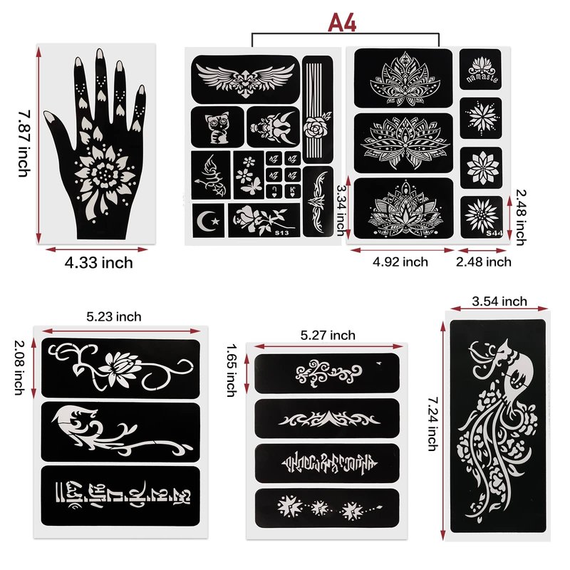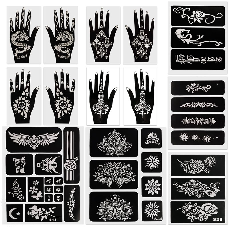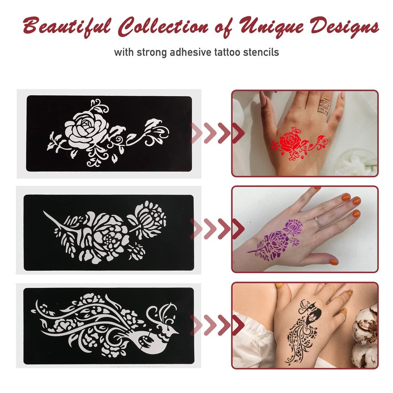 - 1、 Kapopi henna tattoo set Includes a variety of different styles and designs of hand stencils and floral tattoo stencils for you to create beautiful, unique and perfect tattoos.