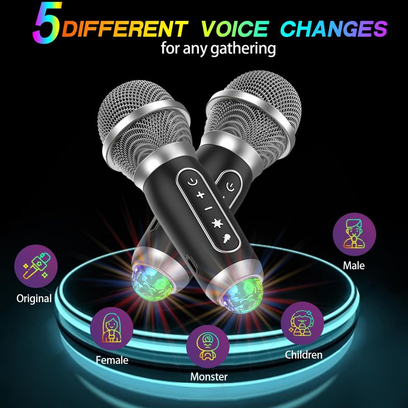 - 【Funny Voice Change】The karaoke microphones feature 5 magic voices (monster, children, female, male, and original voice), providing endless fun for adults and kids alike. Long-press the voice button to switch between different sound effects; short-press to toggle the original sound on/off.