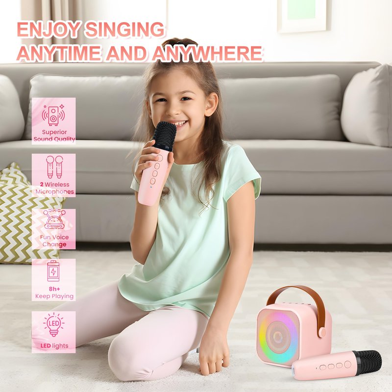 Karaoke Machine for Kids Adults, Mini Portable Bluetooth Karaoke Speaker with 2 Wireless Microphone and Lights, Birthday Gifts for Girls Ages 4, 5, 6, 7, 8, 9, 10, 12+ Family Home Party (Pink)