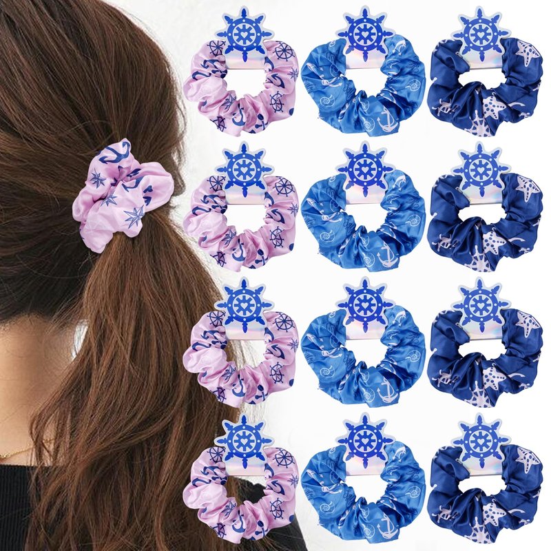 KARAQY 12 Pcs Nautical Hair Scrunchies, Nautical Anchor Print Elastic Silk Satin Hair Ties for Bachelorette Party Favors Wedding Bride Bridesmaid Supplies Accessories