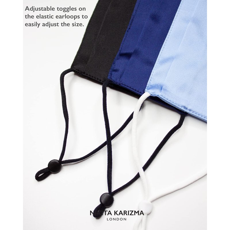 KARIZMA Beverly Hills Collection of Silk Masks for Women. Features: double layer 19 momme 100% Mulberry Silk inside and out, adjustable toggles, nose wire and pleating for comfort and adjustability. Let fresh air in, and keep maskne and irritation out! Available in multi packs with unique vibrant colors like Jewel, Earth or Varied Skin Tone! Also available in single packs as a pretty pink mask, white, champagne, navy blue, gray, olive, beige, and black face mask Choose your fave and elevate your look while honoring the codes of Self Care Club! And who is KARIZMA? Our conversations, projects and collabs with stylists, influencers and celebrities inspire our creations, so you can feel equally beautiful and confident, and ready to share your positive message to the world, too! Perhaps that is why our reusable mask is worn by so many stylish celebs!