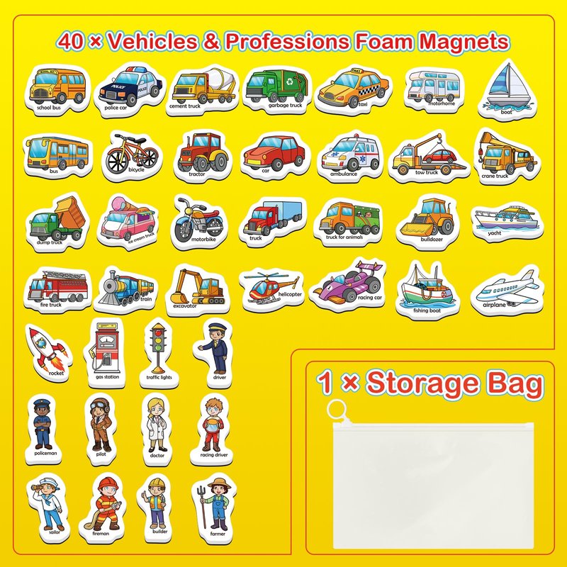 - 【Fridge Magnets for Toddlers】Vehicle magnets set contains 40 vehicle & profession magnets and 1 storage bag. Bright and cute magnetic foam objects can attract children's eyes and keep their attention, which can help them have fun while learning vehicle & profession words.