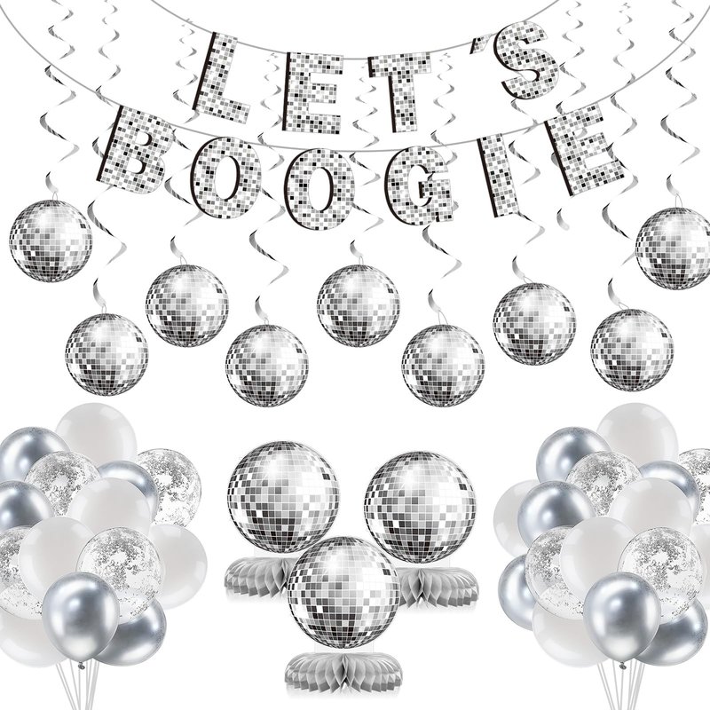 Features: Memorable disco party: If you are looking for more silver disco party supplies, check out our full range of decorations, including a banner, swirls, centerpieces, balloons and more. With what you need to throw a memorable disco party, you can focus on dancing the night away and create memories with your friends and family. Create a night to remember: So dust off your bell bottoms and get ready to groove with these disco party decorations. Whether you're celebrating a milestone birthday, a graduation, or just looking for an excuse to throw a retro themed party, these decorations will help you create a night to remember. Let's boogie. Specifications: Main material: paper and latexMain color: silverSize: as pictures shownPackage includes: 1 x Let's boogie banner30 x Disco latex balloons10 x Disco ball swirl cards10 x Disco silver swirls3 x Disco ball centerpieces2 x Silver rope rollsNotes: Manual measurement, please allow slight errors on size. The color may exist a slight difference due to different screen displays. Winding risk may exist, please keep our product away from children. Do not overinflate the balloons to avoid bursting.