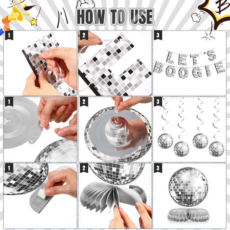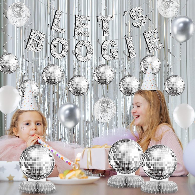 - Disco Ball: no disco party is complete without a disco ball, so we've got you covered with our silver disco ball hanging swirls and disco ball table centerpieces; With retro designs and silver accents, they create an authentic disco atmosphere in your room; They will tie together the whole party theme and bring a touch of nostalgia to your event