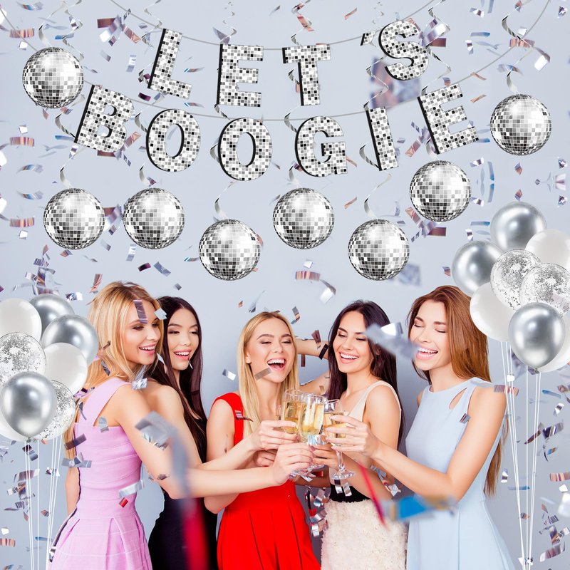 - Let's Boogie: we have the [Let's Boogie] banner, made of quality paper in silver color, which can be easily strung together and hung using the string included in the package; This is a fun and festive disco decoration that will set the tone for your disco theme party; Hang it up as a backdrop for photos or above the dance floor to keep the party going all night long