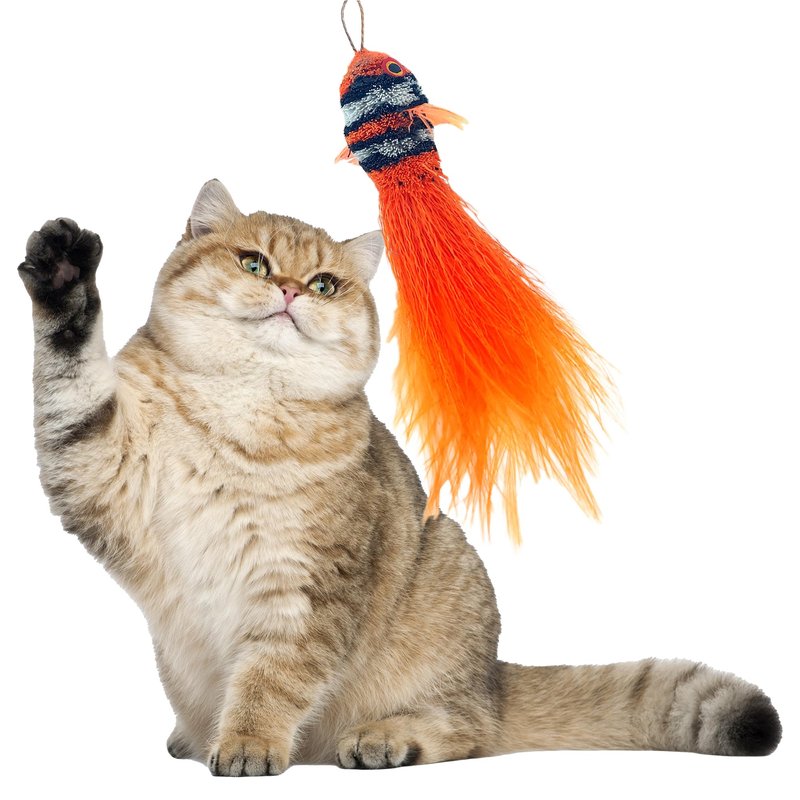 - ENHANCE PLAYTIME: Elevate your cat's playtime with Katfly's Clownfish cat teaser toy refill. Measuring approximately 3 inches, it features real feathers that'll keep your feline friend engaged and entertained for hours.
