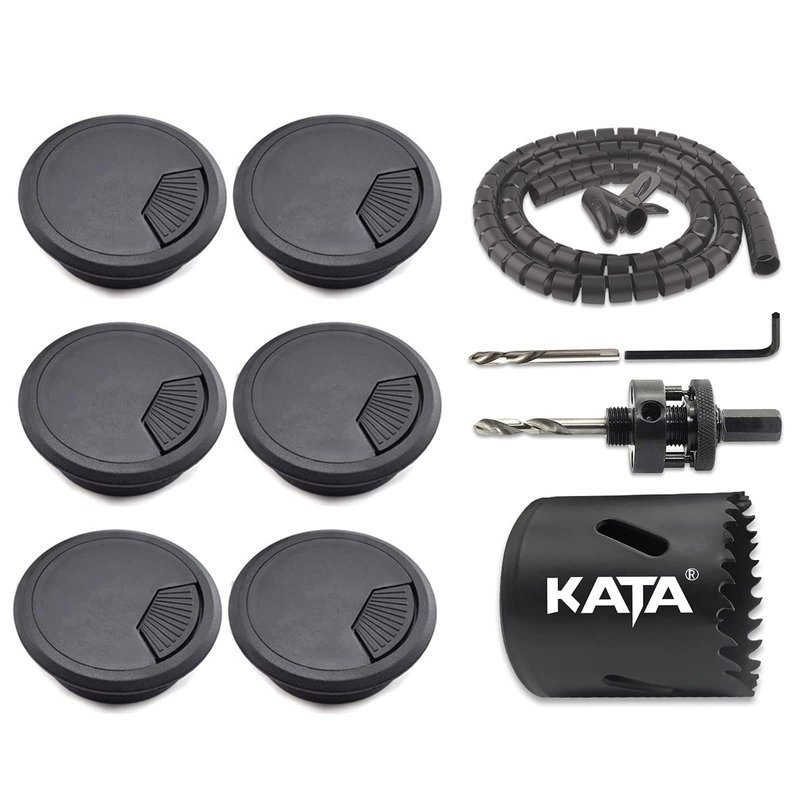 KATA 6-Pack Desk Grommet 2 Inch (50mm) Wire Cord Cable Desk Hole Cover with Bi-Metal Hole Saw Kit and Cord Wire Wrap Coiled Tube Sleeve Management, 2M Cable Sleeve Organizer
