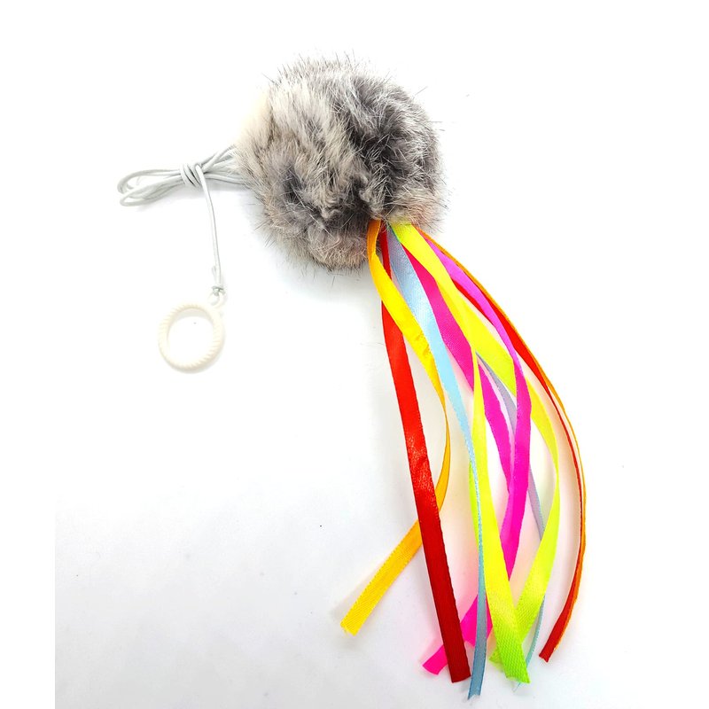 Great exercise for your cat! A new version on our bouncy ball. Colorful ribbons attached for more fun kitty play. The elastic cord creates a bouncy movement which will excite and entertain your cat. Add to their cat furniture, a doorknob or interact with you! Cord is about 36 inches long. Gray pom is real rabbit fur.