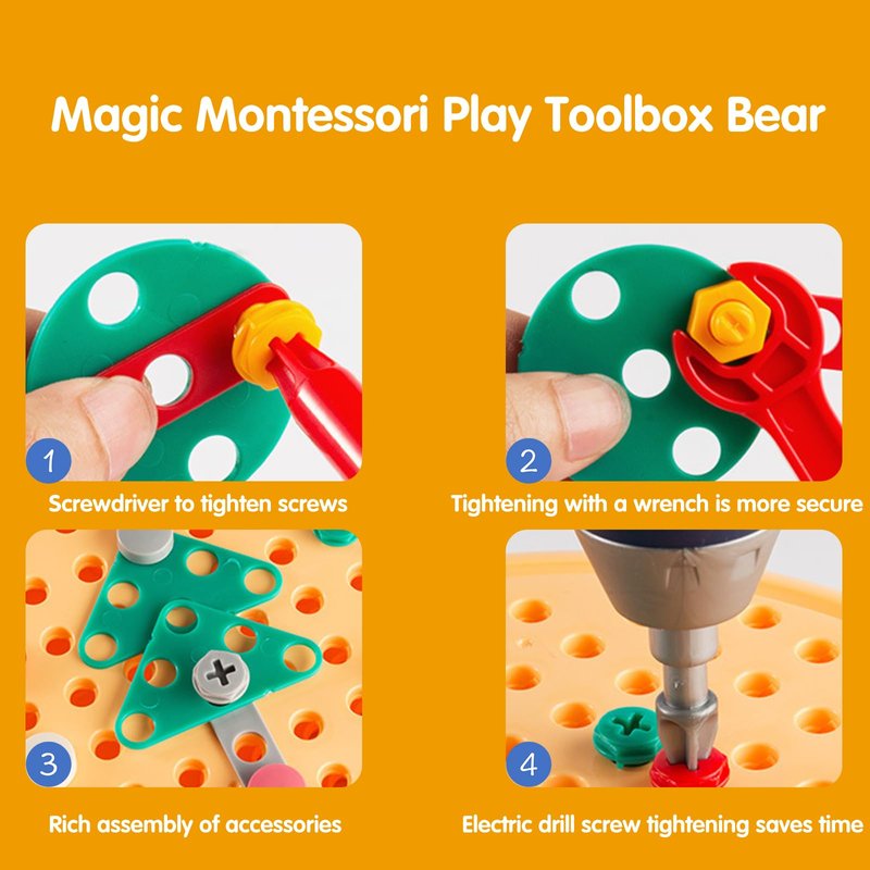 - 【Magic Montessori Play Toolbox Drill】 Our 224 piece drill set for kids includes a real electric drill that allows youngsters to screw and unscrew the set's nuts and bolts. For children 3+ ages, it's the ideal mosaic drill toy set for building toys