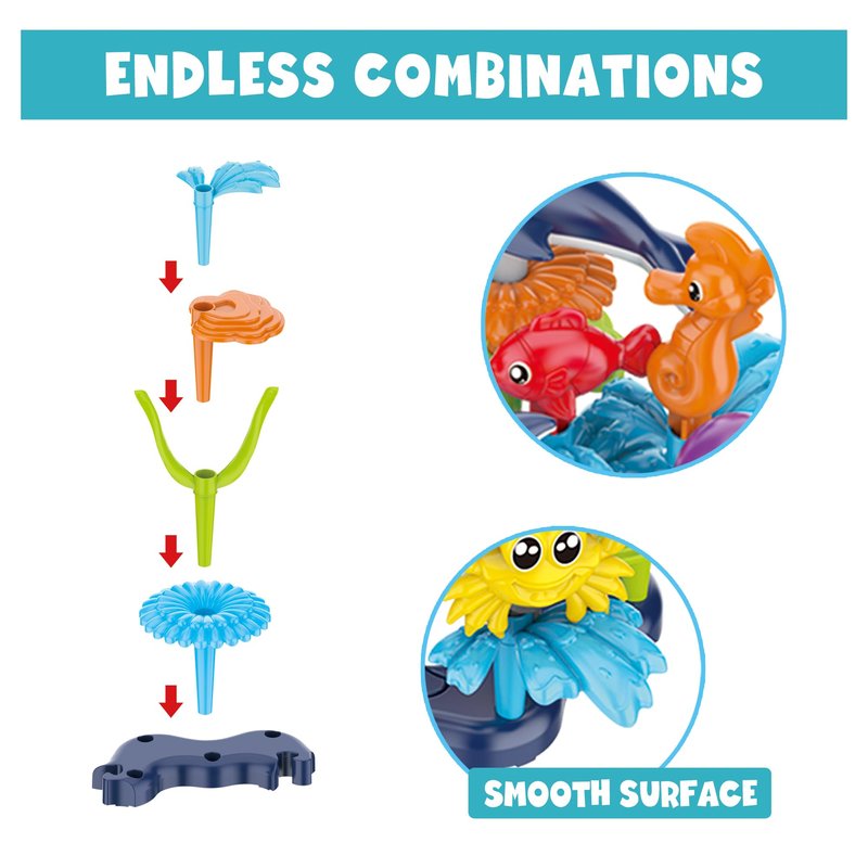 Easy Stacking into the base and stacking up with colorful end caps like sea star, sea spray, and seaweed. Their world will come alive under the ocean with all the unique DIY toy creations they will create. Create different reef garden building arrangements with the base pieces like circle or large reef pattern. They will be engaged and playing for a long time while they stack high and arrange underwater scenes. All Pieces stack and glide easily into each other. Great for little hands.