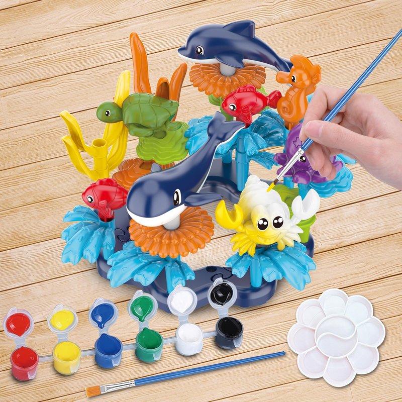 KC Republic Ocean Reef Sea Creatures 37pcs Water Washable Painting & Building Toy Set, Children's Activity Art Kit, Paint Your Own Buildable Ocean Reef Toy with Seahorse, Fish, Dolphin, Shark, Crab