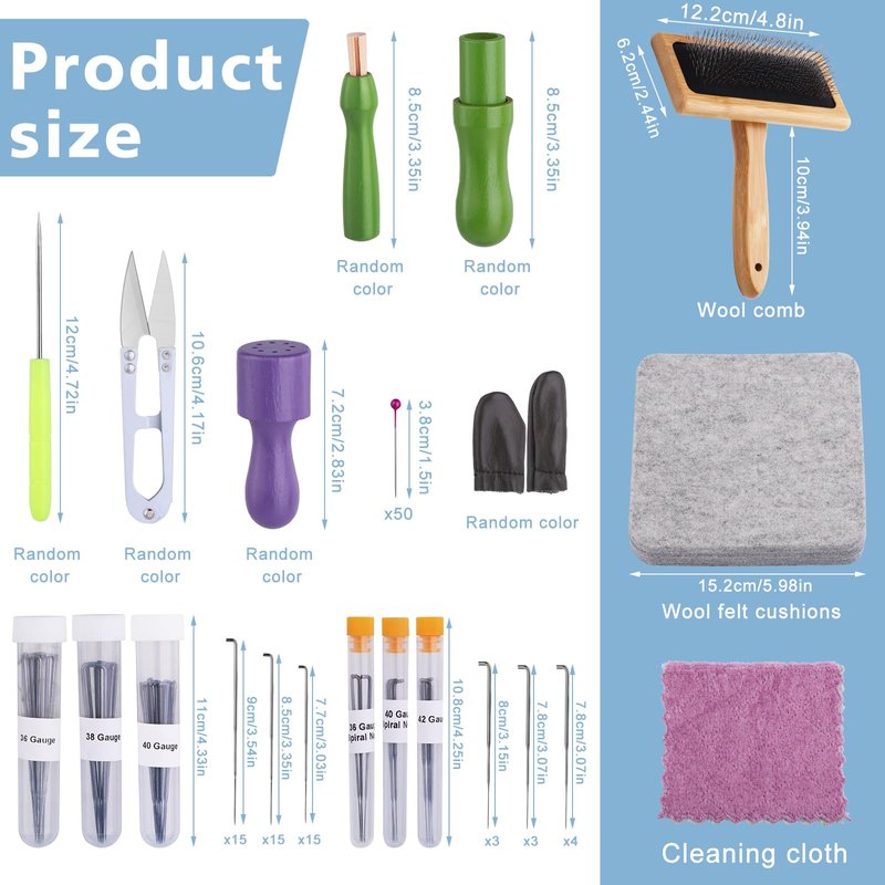 Needle Felting Tools: you will receive 2 pieces of wooden carders for wool, 55 pieces of needle felting tools includs 6 Styles of Wool Needles, a box of locating pins,1 needle felting pad, 1single-needle, 1 three-needle, 1 eight--needle,etc. Satisfy your daily use, replacement demands, and you can share with your family members.