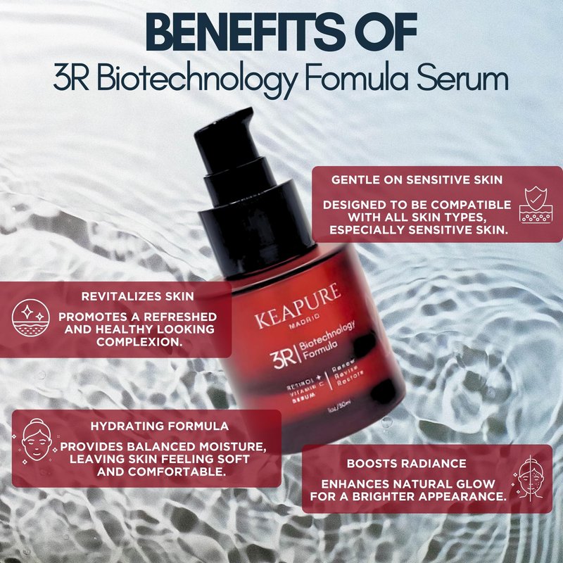 Keapure 3R Revitalizing Serum combines the power of nature and science to enhance your skin’s natural beauty. This lightweight serum is designed with our unique 3R technology to renew, revive and restore, using Retinol and Vitamin C to promote a radiant, refreshed look. Sensitive-skin friendly, the 3R serum provides deep hydration while balancing moisture levels, so your skin feels smooth, comfortable, and renewed. Free from parabens, harsh chemicals, and sulfates, this serum is perfect for those who seek gentle yet effective skincare. Our carefully curated ingredients, like Retinol and Vitamin C, help improve overall skin appearance and radiance without irritation. Add Keapure’s 3R Revitalizing Serum to your daily routine and experience a new level of skin care for a naturally beautiful, glowing complexion.