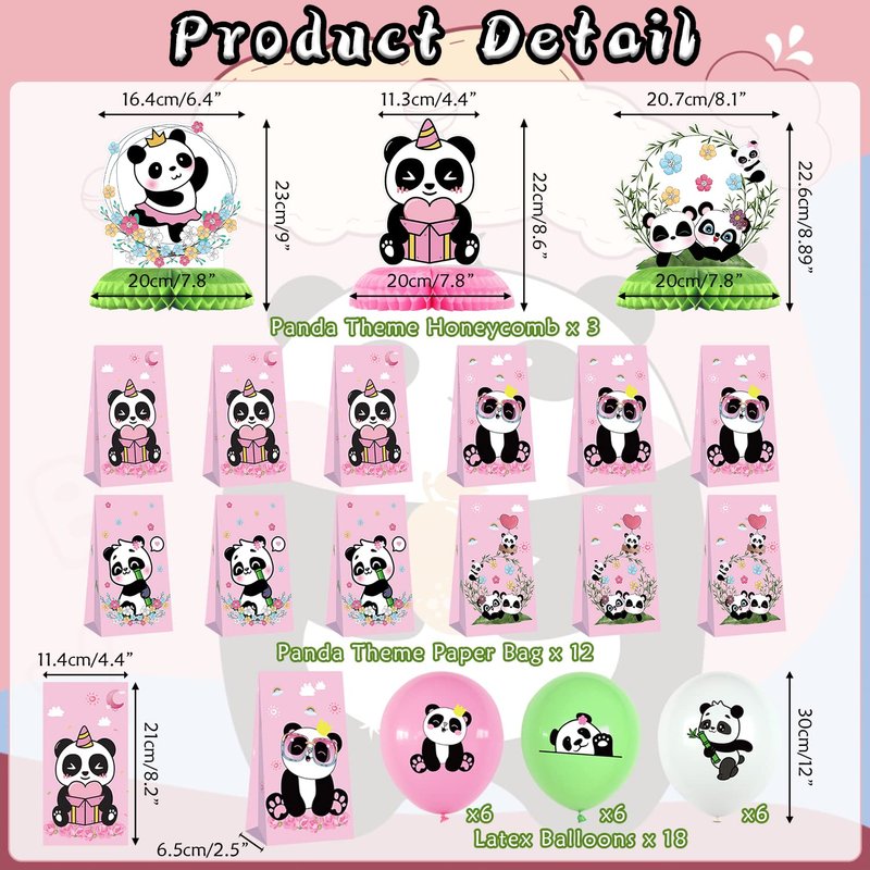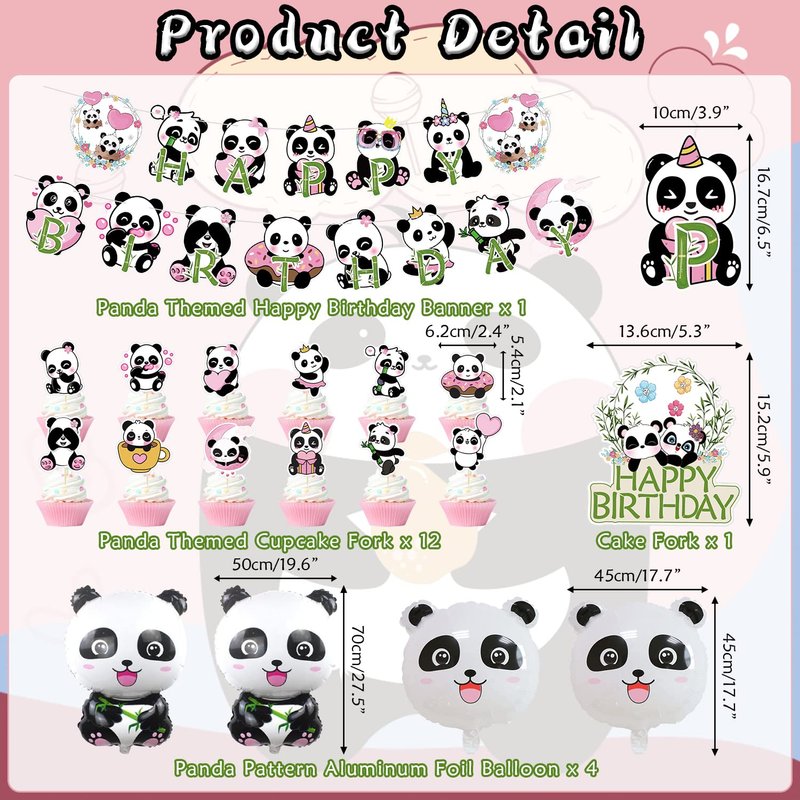 - Panda party supplies set includes: 1 HAPPY BIRTHDAY banner, 12 Panda gift bags, 3 Panda centerpieces, 1 large cake decoration, 12 cupcake decorations, 18 Panda pattern balloons, 4 Cute panda foil balloons, 1 balloon glue, 1 balloon ribbon