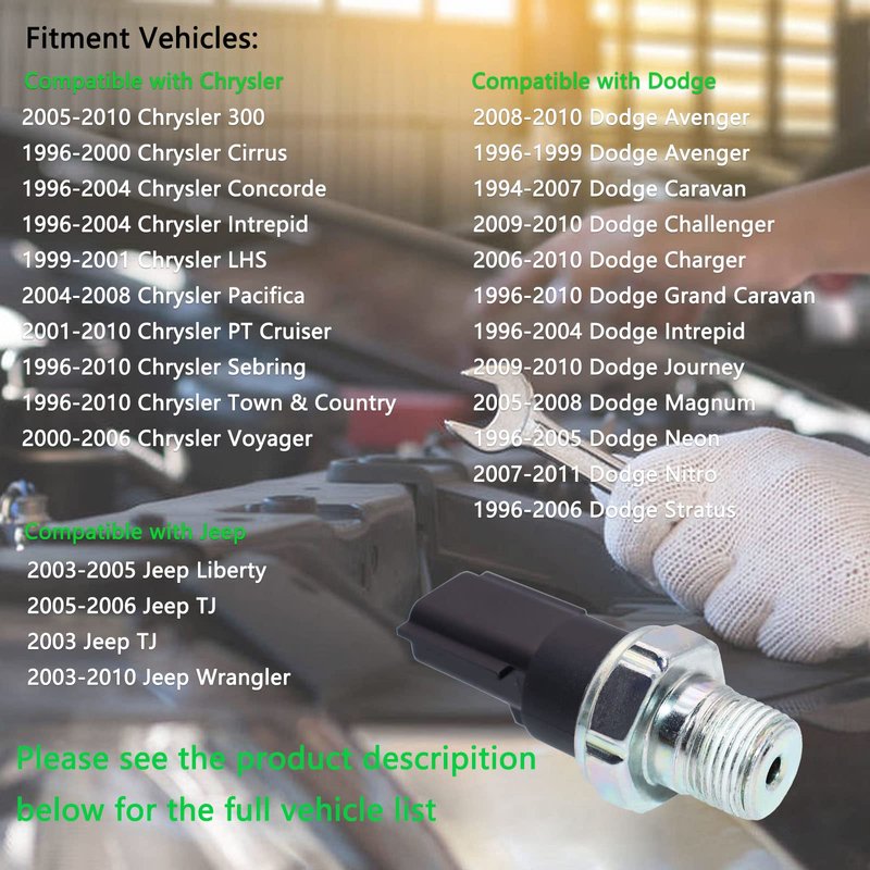 Item: Engine Oil Pressure Sensor Switch for Chrysler Dodge Jeep MINI Plymouth Eagle Mitsubishi VW 5149098AA Pin Counts: 1-pin Package includes: 1 x Oil Pressure Sensor Switch Manufacturer Part Number: 5149098AA, 4608303, 4608303AB, 4609026, 4687649, 4707670, 12611500893 Interchange Part Number: MO4687649, 7B0919081A, 12617513068, 1S10875, 4608303BA, 5149189AA, 5149261AA, 88924460 Other Part Number: M04687649, PS712, PS287, PS278, PS407, 1S6670, S4178Z, OPS808, OP67831, 80005, 57310, 53-33620 Fitment Vehicles: Compatible with Chrysler 300 2005-2010 300M 1999-2004 Cirrus 1996-2000 Cirrus 2002 Concorde 1996-2004 Grand Voyager 2000 Intrepid 1996-2004 LHS 1999-2001 LHS 1996-1997 New Yorker 1996 Pacifica 2004-2008 PT Cruiser 2001-2010 Sebring 1996-2010 Town & Country 1996-2010 Voyager 2000-2006 Compatible with Dodge Avenger 2008-2010 Avenger 1996-1999 Caravan 1994-2007 Challenger 2009-2010 Charger 2006-2010 Grand Caravan 1996-2010 Intrepid 1996-2004 Journey 2009-2010 Magnum 2005-2008 Neon 1996-2005 Nitro 2007-2011 Stratus 1996-2006 Compatible with Jeep Liberty 2003-2005 TJ 2005-2006 TJ 2003 Wrangler 2003-2010 Compatible with Plymouth Breeze 1996-2000 Grand Voyager 1996-2000 Neon 1996-2001 Voyager 1994-2000 Compatible with Eagle Talon 1996-1998 Vision 1996-1997 Compatible with Mitsubishi Eclipse 1996-1999 Compatible with Volkswagen Routan 2009-2011Compatible with Mini Cooper 2002-2014