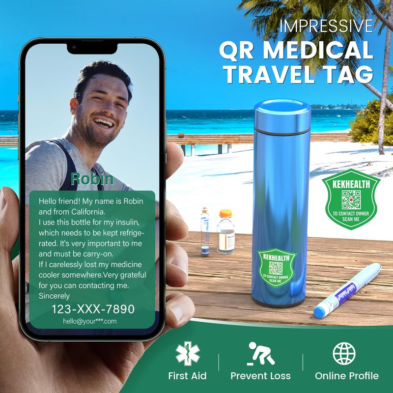 - 【PREMIUM HARD MEDICINE COOLER】-->KEKHEALTH insulin cooler travel case can meet the challenge of safe and portable transportation of temperature-sensitive drugs under extreme temperatures-->KEKHEALTH QR Medical Travel Tags are thoughtfully designed to be lifetime anti-lost, emergency, life-saving and extremely easy to use!